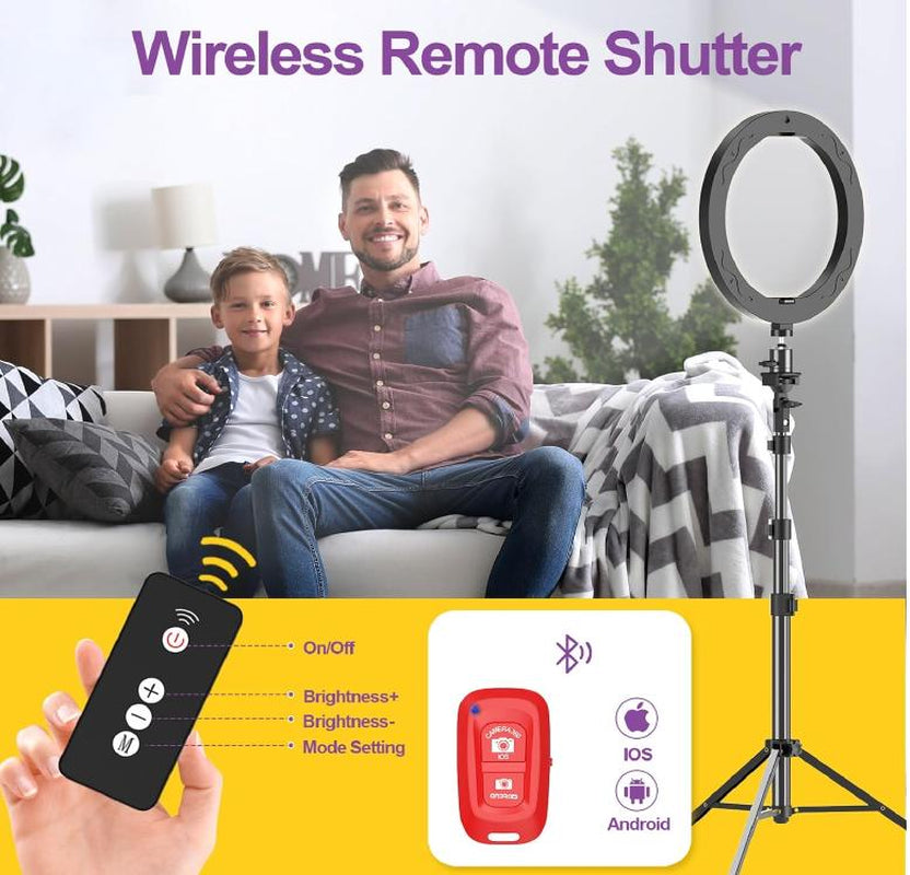 【2 Remote Control】The kit come with a controller for round light and a bluetooth remote (30ft/10m) for camera phone, provide great convenience for you to take pictures. Perfect for live streaming selfie, make-up, YouTube, TicTok photo shooting, etc.