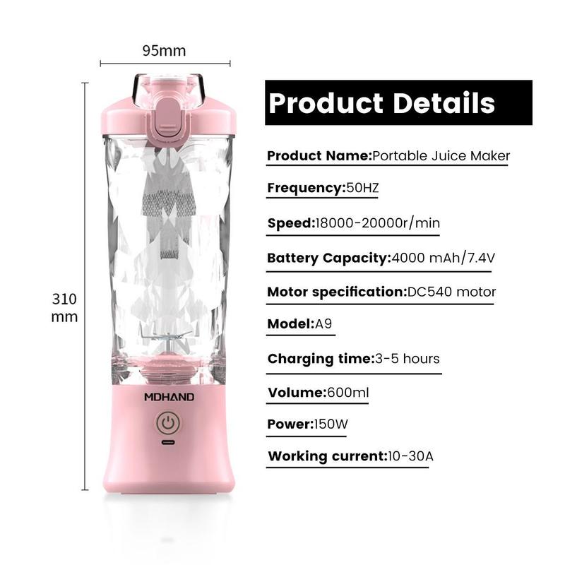 【600ml USB Safety Charge】--The USB juicer cup equipped with rechargeable high quality batteries that can be recharged in a variety of ways, like charging by power bank, AC Adapter and computer, and charging time is 3-5 hours; fully charged can produce 10 cups of juice.